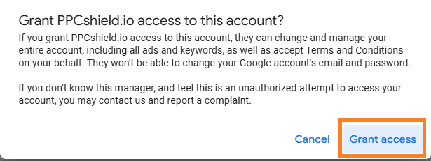 3. پس از این مرحله وارد اکانت گوگل ادز مربوطه شوید. در بخش admin وارد زیر منوی access and security شوید و از تب managers دسترسی ppc shield را طبق تصویر تایید کنید
